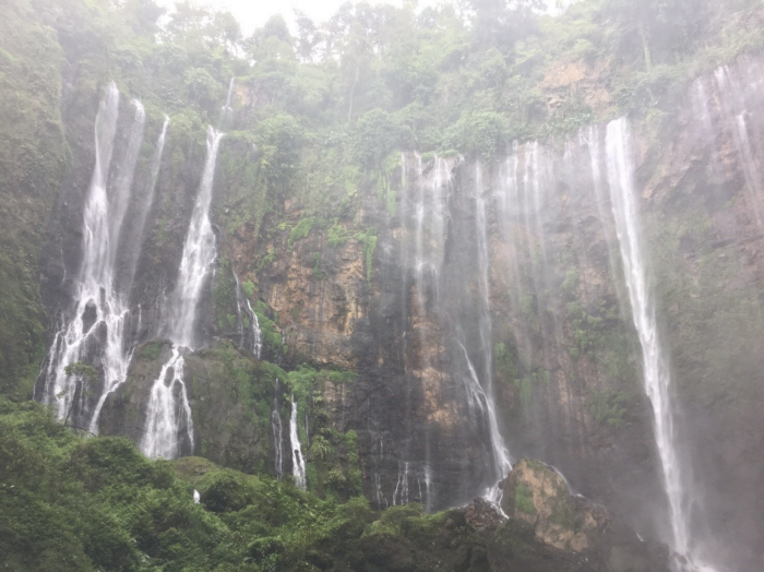 น้ำตก Tumpak Sewu, ลักษณะของน้ำตก เป็นเส้นน้ำไหลผ่านหน้าผาที่มีความสูง 300 เมตร เว้าเข้าไปเหมือนเส้นครึ่งวงกลม…. เส้นสายของน้ำตก มีความหนาบางตามธรรมชาติรังสรร เมื่อมองด้วยตาเปล่า จะเห็นว่า มีสายน้ำตกไหลลงมา ในทุกๆ องศาของรัศมีครึ่งวงกลมนั้น… จึงไม่แปลกเลยที่ชาวบ้านจะเรียกน้ำตกนี้ว่า Tumpak Sewu (หนึ่งพัน) หรือชื่อไทยที่ผมตั้งเองว่า “น้ำตกพันวารี”