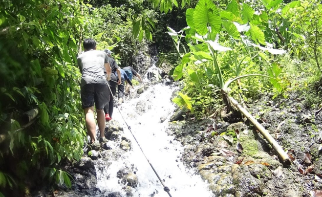 เจ้าหน้าที่ประจำอุทยานที่ช่วยนำทางเราชื่อคุณพุทธิ เดินจากจุดชมวิวไปสักพัก ก็เริ่มมองเห็นฟิลผจญภัย… ไม้ไผ่ที่ลาดลงรัวๆ แบบไม่มีจุดพัก ทำให้เป็นห่วงกันว่า ขาขึ้นจะไหวกันหรือเปล่า… โชคดีที่อุปกรณ์ต่างๆ จัดทำไว้อย่างแข็งแรง ความกลัวจึงไม่ค่อยเข้ามาย่างกรายเท่าไหร่… แต่คิดได้อย่างนั้นไม่นาน… เส้นทางไม้ไผ่ก็หมดลง และกลายเป็นการโรยตัวตามเชือกไปบนเส้นทางน้ำตกสายหนึ่ง… โอ้ว… ไม่ได้คาดคิดว่าจะต้องลุยกันขนาดนี้ แต่ก็ไม่ยากเกินความสามารถของสมาชิกในทีมทั้ง 5 คน (ที่เพิ่งซื้อรองเท้าแตะรัดส้นจากจุดพักรถกันมา คู่ละ 100 บาท)