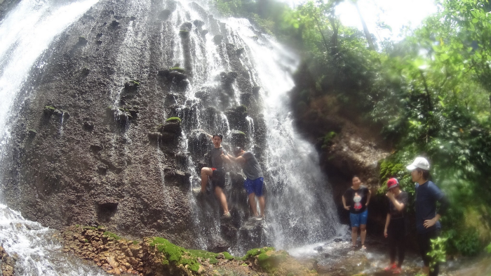 ลักษณะน้ำตกที่ไหลบนโขดหินที่มีลักษณะเหมือนหินงอกหินย้อยสีดำมืดขนาดใหญ่ตามหน้าผาสองข้างทาง… เป็นภาพที่ผมไม่เคยเห็นมาก่อนเลยในชีวิต… ยิ่งเดินก็ยิ่งหลงรักกับภูมิทัศน์ที่แปลกตากว่าทุกสถานที่ที่ผมเคยไปมา… บางจุดเป็นโขดหินมอสหลังม่านน้ำตก ให้เราได้ปีนป่ายเล่นราวกับเป็นหน้าผาจำลอง… อีกส่วนหนึ่งก็เป็นบ่อน้ำที่มีความใสสุดๆ พร้อมรอให้เราลงไปเล่นแช่น้ำ ทั้งยังมีเครื่องนวดหลังพลังน้ำตก… นี่มันคือจากุซซี่ที่ไม่ต้องใช้ไฟฟ้า… บอกได้เลยว่า… โข้ดฟิน…