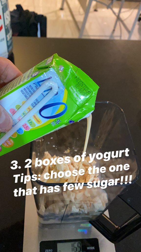 3. ใส่นมเปรี้ยว 1 กล่อง (หรือ 2 กล่องได้ ถ้าต้องการรสชาติที่ดี แต่จะมีน้ำตาลเยอะ)